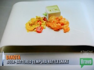 “When we walked into the Top Chef kitchen, live rattlesnakes coiled in a glass aquarium, and I guessed what our quick fire meat was.  But, we all thought that in those wood boxes in front of us live rattlesnakes waited for the killing, skinning and butchering.”