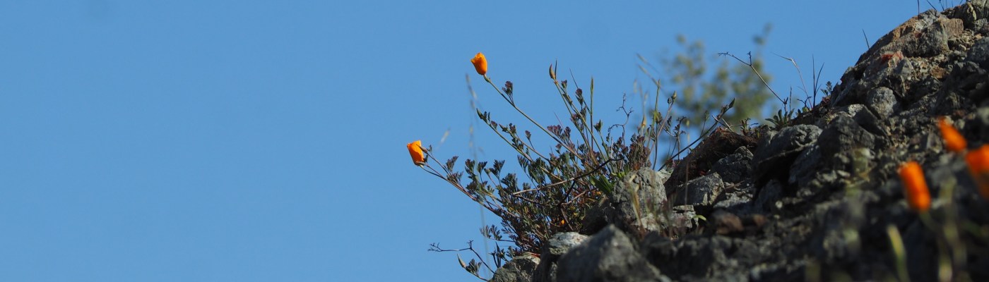 While choirs harmonized their songs of hallelujah on Easter Sunday, and children anxiously hunted colored eggs and sweet treats to fill their baskets, and while adults busily prepared a special holiday feast, I asked Spouse to take me on a hunt for more wildflower photos. It was a hallelujah moment when the light from a partially clouded sky spread its magic against a hillside of solidified black rocks with fragile, but robust stands of California poppies.