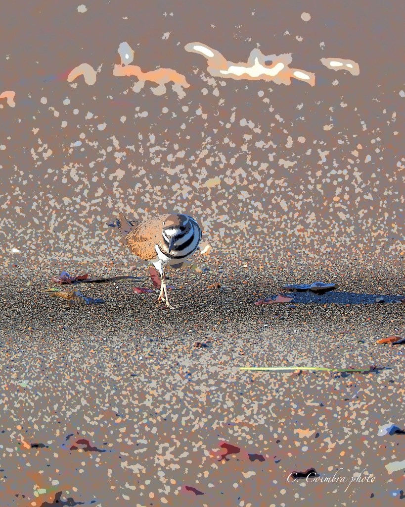 But that’s why I brought my companion, Oly. I dismantled the 12 mm lens for my 150—always a safe bet when I was unsure what to photo. Sanderlings, plovers, gulls and sandpipers scooted and shuffled about—not at all concerned about me on a nearby log. I focused and snapped a few shots, but they left me uninspired. So I became the proverbial lump on a log that gazed across the wet sand toward the western horizon.