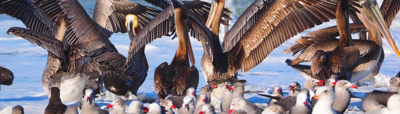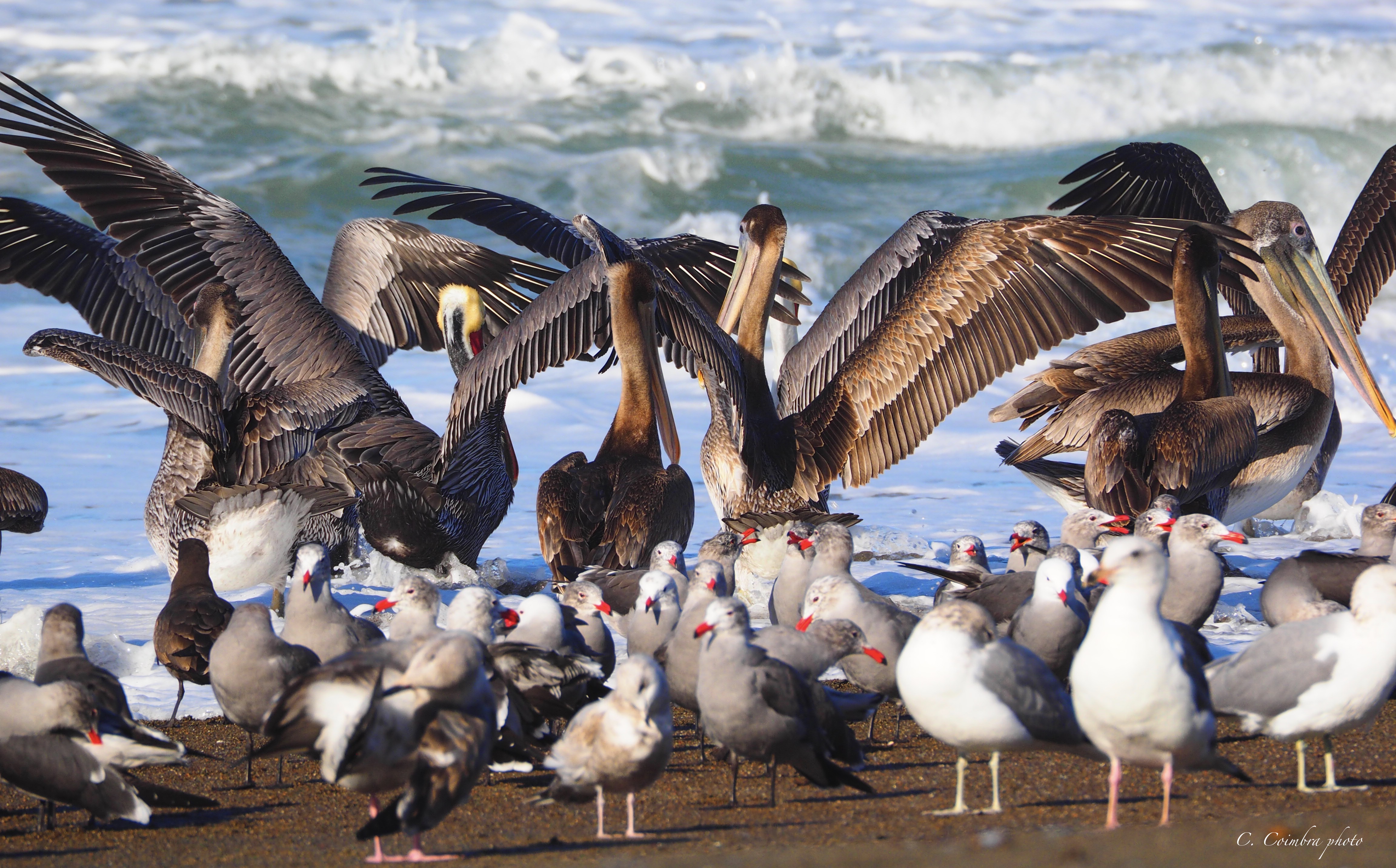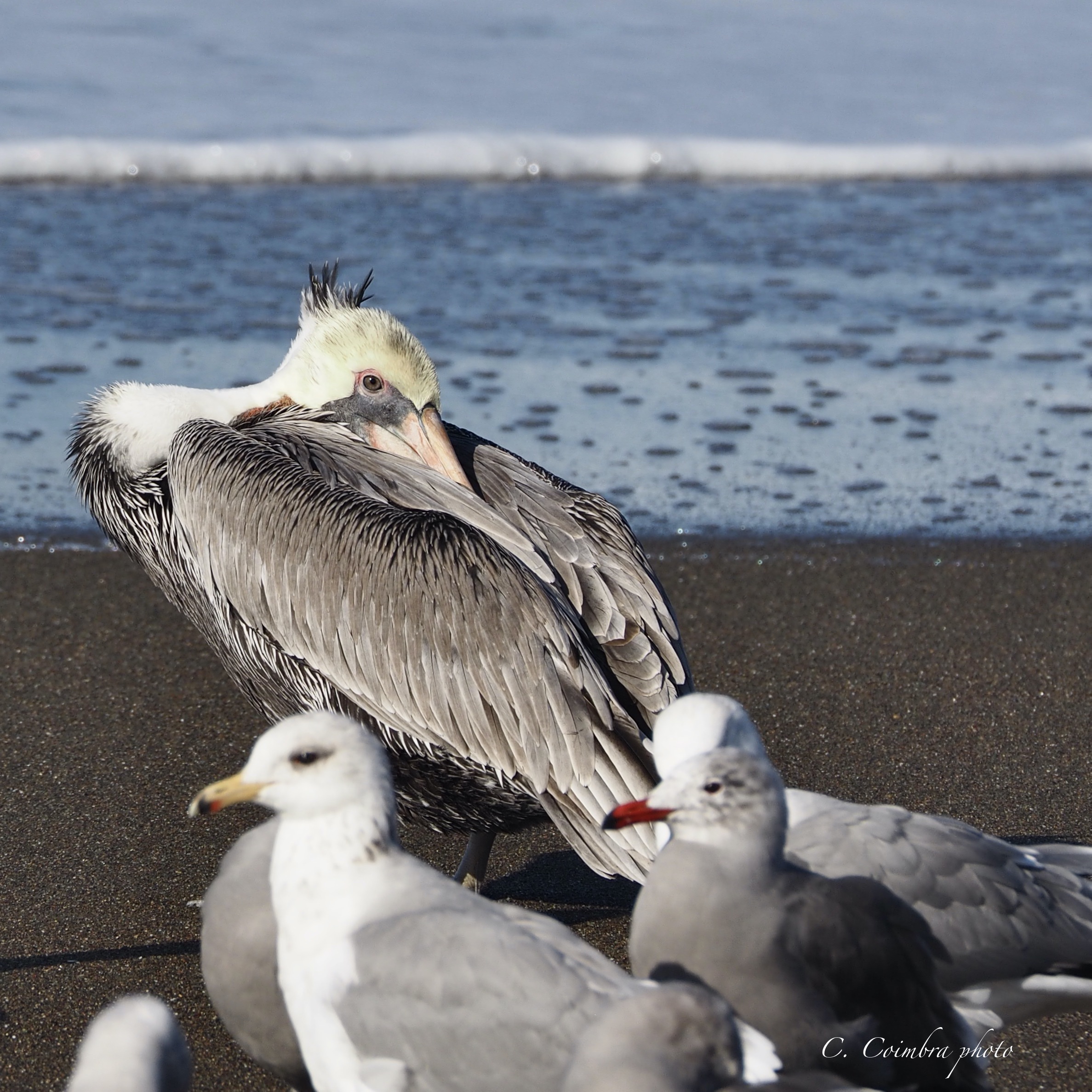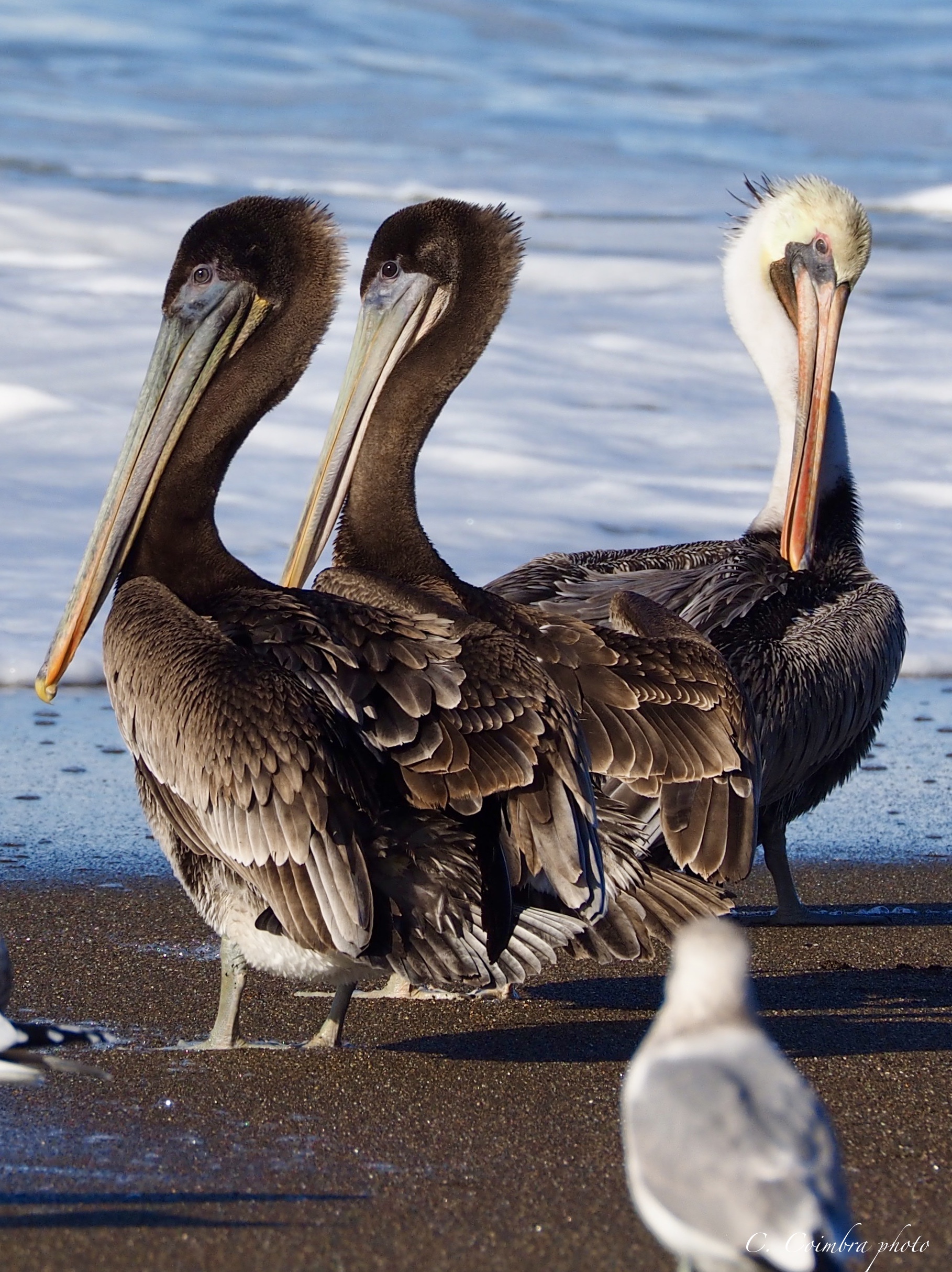 I’m not one to sulk and wallow in my own misery. So I switched to my 300 mm lens. Some interesting activity up the beach caught my eye.  I zoomed in on the scene. Suddenly I forgot about my morning conversation with my physician.  A pod of brown pelicans — maybe close to a hundred, the males in their colorful mating plumage, and the females seemingly enjoying the attention, beckoned Oly and I to get a little closer.