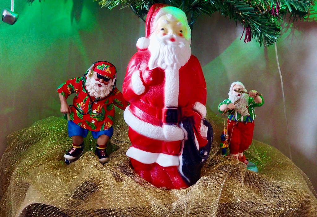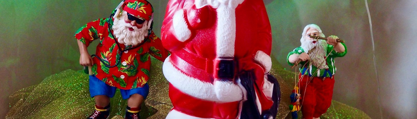 He’s accompanied by newer versions of Santa: one shoed in roller skates and donning a Hawaiian shirt; another manipulating puppets. On the piano, you’ll find the high-tech Santas that sing and dance to Christmas music, and ask boys and girls what they would like for Christmas. But the greatest Santa of all, is a seasoned blow mold Santa under the Christmas tree.