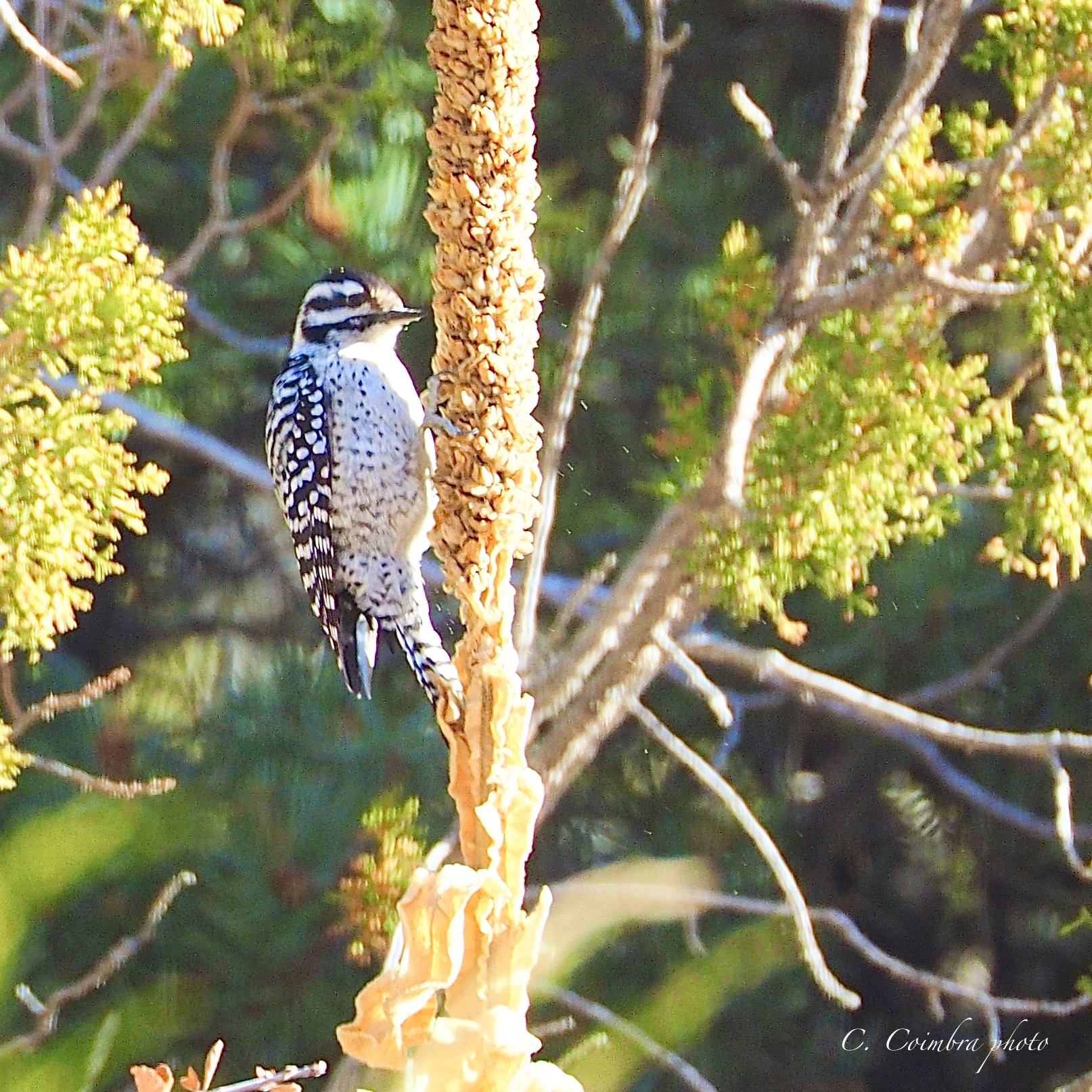 The biggest gift of all? Finally, over a year later of transplanting the magical mullein plant, this morning a female ladder-back woodpecker visited the suet feeder and then spied that magical plant. And I actually had my 300 mm lens attached to Oly (my Olympus OM-D camera), with a clean disk ready to capture the morning’s discovery.