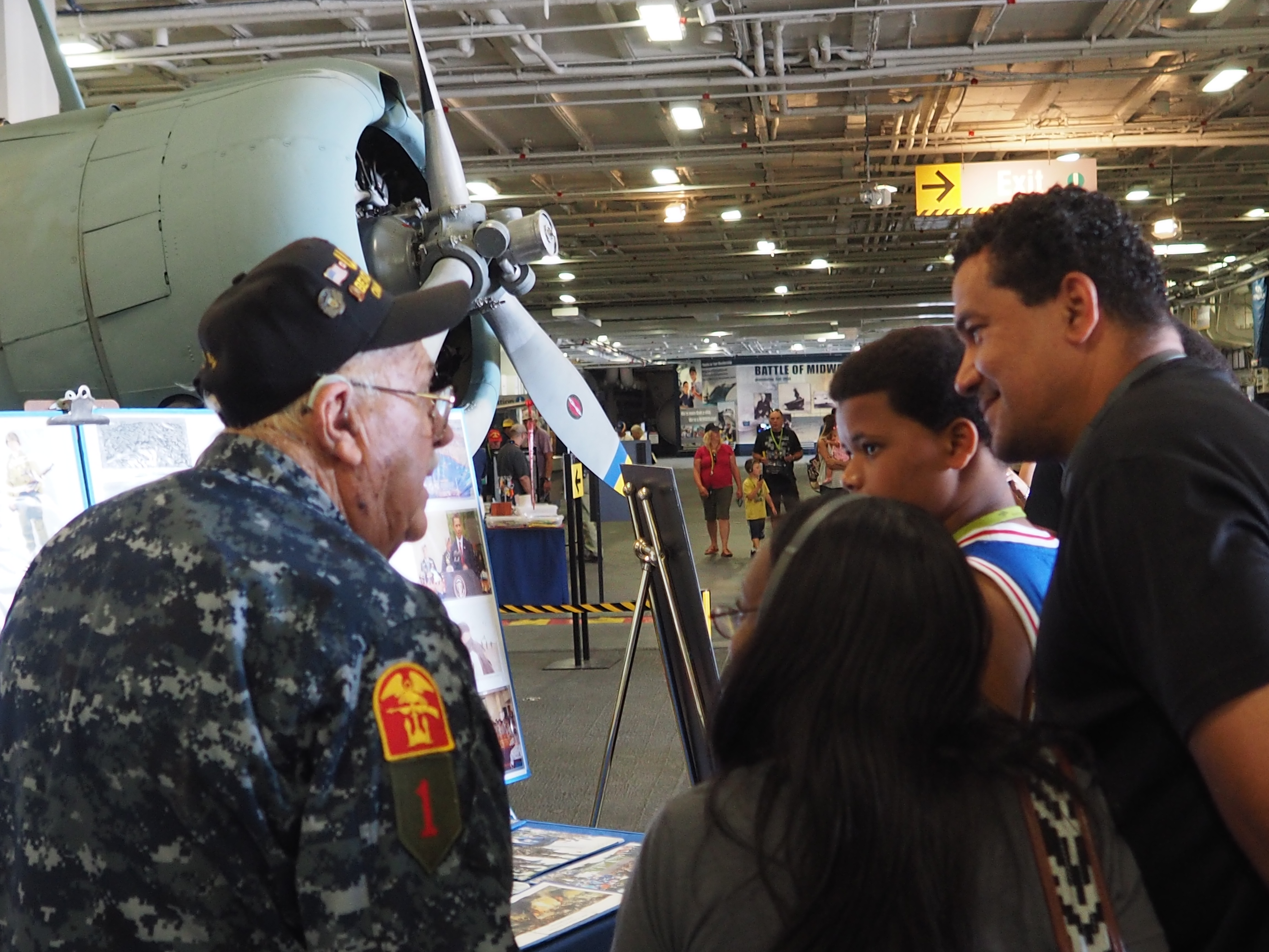 For the next 45 minutes we helped Bob carry and set up an 8-foot table next to a roped-off vintage airplane; I covered the table with a blue cloth that read “ USS Midway Museum,” and Bob said, “You’re definitely a volunteer. How can I tell? You know how to set up a display.” I laughed as we each broke out a sweat in the warm innards of that massive WWII vessel. A crowd began gathering around the display of priceless photos, and news clips. Like a magnet, young and older folks circled Bob, asked questions and listened as he shared his tales of an American youth’s exceptionalism 70 years back.