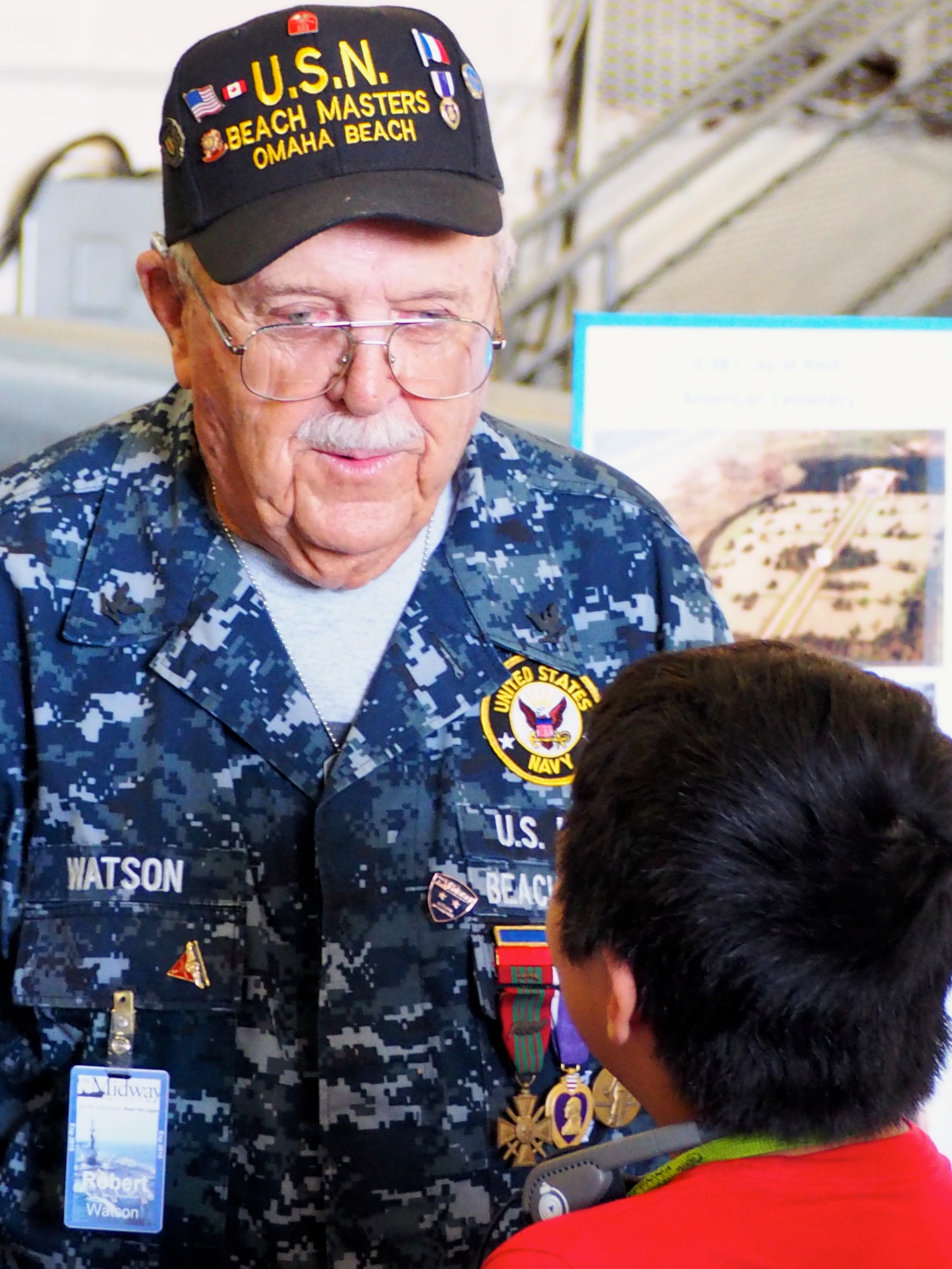 If my grandson wasn’t celebrating his 7th birthday in San Diego; if his party wasn’t delayed by an hour; if I wasn’t hopelessly curious and then amazed at the size of the USS Midway Aircraft Carrier on public display as a museum; if I did not park my car in this one lot of many, many parking lots for the museum—just to kill some time; and if USN Beachmaster Bob Watson wasn’t unloading his display that he sets up in the museum as we approached the entrance; and if I probably didn’t reek of a volunteer-type, I never would have had the absolute honor of this older gentleman’s question posed to spouse and me: “You look like nice people. Do you want to get into the museum free?”